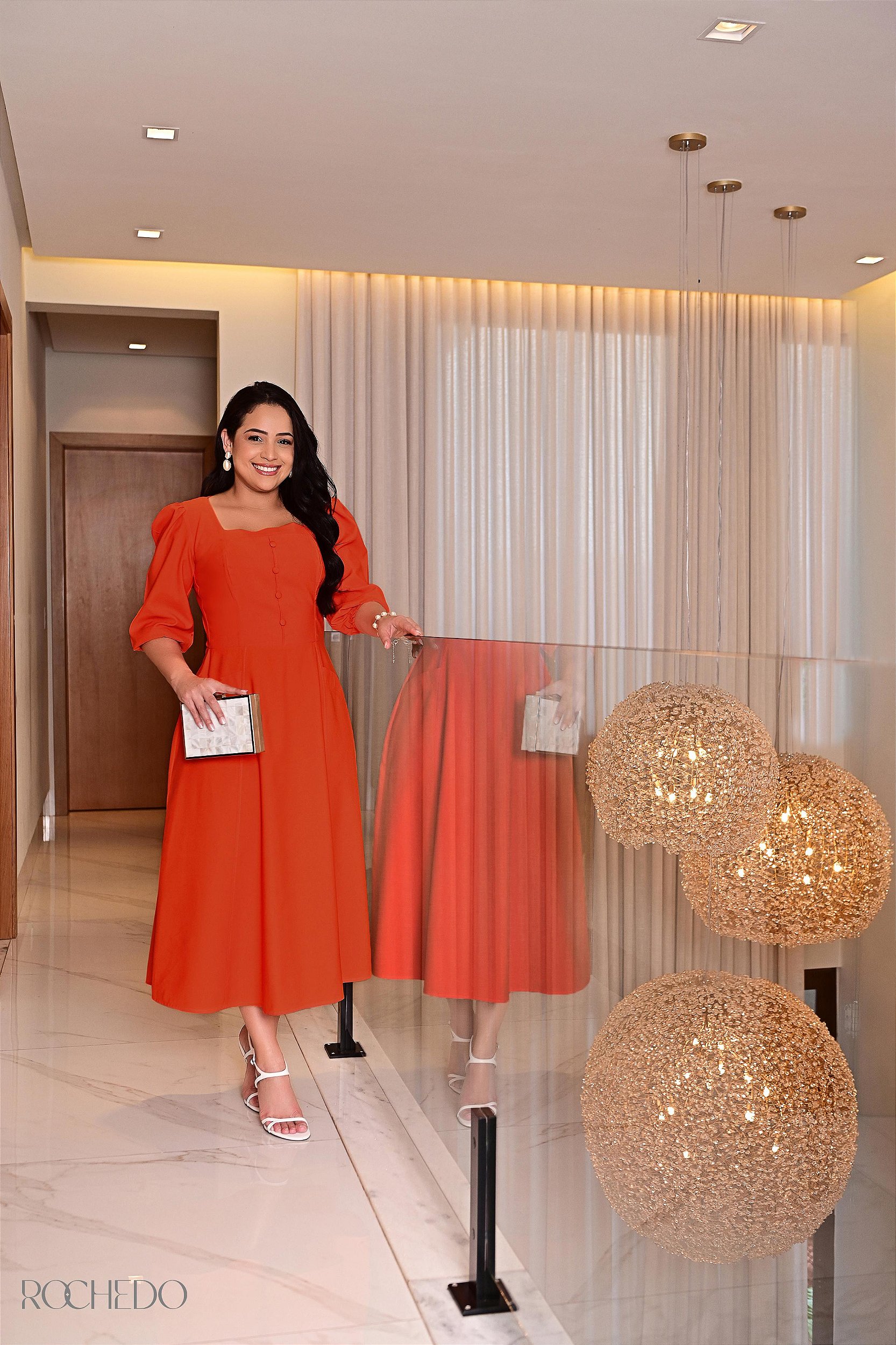 Vestido Midi, confeccionado em tecido de alta qualidade, na cor laranja e no tamanho, G.