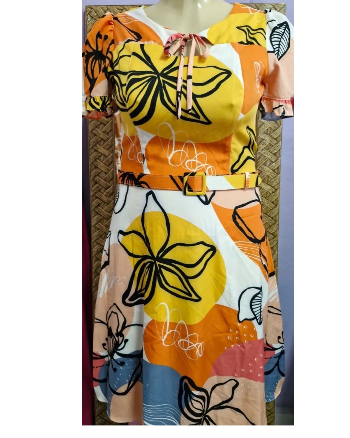 Vestido midi em tecido crepe estampado no tamanho G e GG, na cor amarelo.